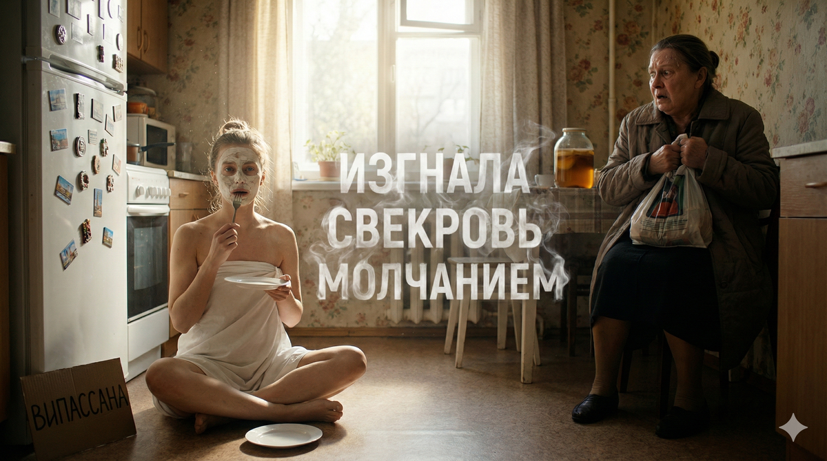 Утро воскресенья Галина Борисовна встретила в боевой готовности. Она проснулась с петухами (точнее, с перфоратором соседа) и пошаркала на кухню, предвкушая скандал по поводу немытой посуды. — Полинка! Вставай! Хватит дрыхнуть! — заорала она, распахивая дверь. И осеклась. Посреди кухни, на коврике (который Галина вчера назвала "пылесборником для астматиков"), в позе лотоса сидела Полина. Она была замотана в белую простыню, как мумия, решившая заняться йогой. Лицо было белым от косметической глины. Глаза закрыты. На шее висела картонка с надписью жирным маркером: «СВЯЩЕННАЯ ВИПАССАНА. ОБЕТ МОЛЧАНИЯ. ОЧИЩЕНИЕ КАРМЫ ОТ СКВЕРНЫ. ЛЮБОЕ СЛОВО УБИВАЕТ ЭНЕРГИЮ ЦИ». — Ты чего? — Галина попятилась. — Сдурела? Какая энергия? Жрать давай готовь! Полина медленно открыла глаза. Взгляд был стеклянным, направленным сквозь свекровь. Она плавно подняла руку. Дзынь! Чистый, высокий звук колокольчика разрезал воздух. — Хватит звенеть! — взвизгнула Галина. — Ты нормальная вообще? Я с тобой разговариваю! Пол