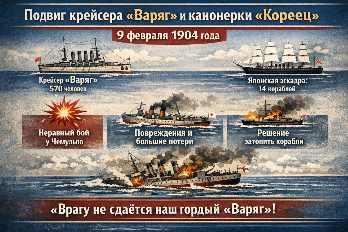 » Наверх, вы, товарищи, все по местам, Последний парад наступает. Врагу не сдаётся наш гордый «Варяг», Пощады никто не желает! Подвиг крейсера «Варяг» — один из самых ярких эпизодов Русско-японской войны, ставший символом мужества моряков. Крейсер «Варяг» и канонерская лодка «Кореец» выступили против целой японской эскадры из 6 крейсеров и 8 миноносцев. Командир «Варяга» Всеволод Руднев отклонил предложение противника о сдаче и решил прорваться с боем. В ходе ожесточенного часового сражения «Варяг» получил серьёзные повреждения (было выпущено более 1000 снарядов, выведена из строя часть артиллерии). Чтобы корабли не достались врагу, экипаж принял решение затопить «Варяг» в бухте, а «Кореец» — взорвать. Моряки не спустили флаг перед неприятелем. Честь и слава русскому флоту!