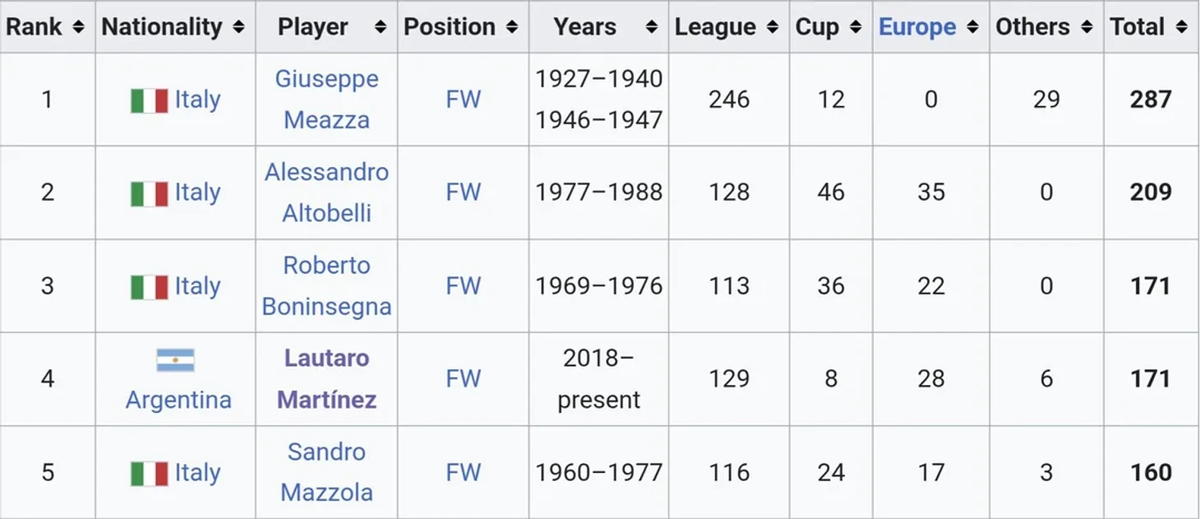 Вчера Лаутаро Мартинес забил в матче с «Сассуоло». И этот гол был особенным, поскольку позволил аргентинцу войти в топ-3 бомбардиров в истории «Интера». Мартинес отличился в 171-й раз и сравнялся по количеству голов с Роберто Бонинсеньей. Впереди только Алессандро Альтобелли (209) и Джузеппе Меацца (287). О рекорде говорить не приходится, но вторую строчку-то пробьет? Напомним, 28-летний Мартинес выступает в «Интере» с 2018-го