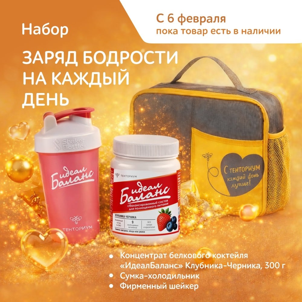 Заряд бодрости на каждый день" (сбалансированный белковый коктейль "ИдеалБаланс" Клубника-Черника 300 г, фирменный шейкер, сумка-холодильник) с выгодой 10%