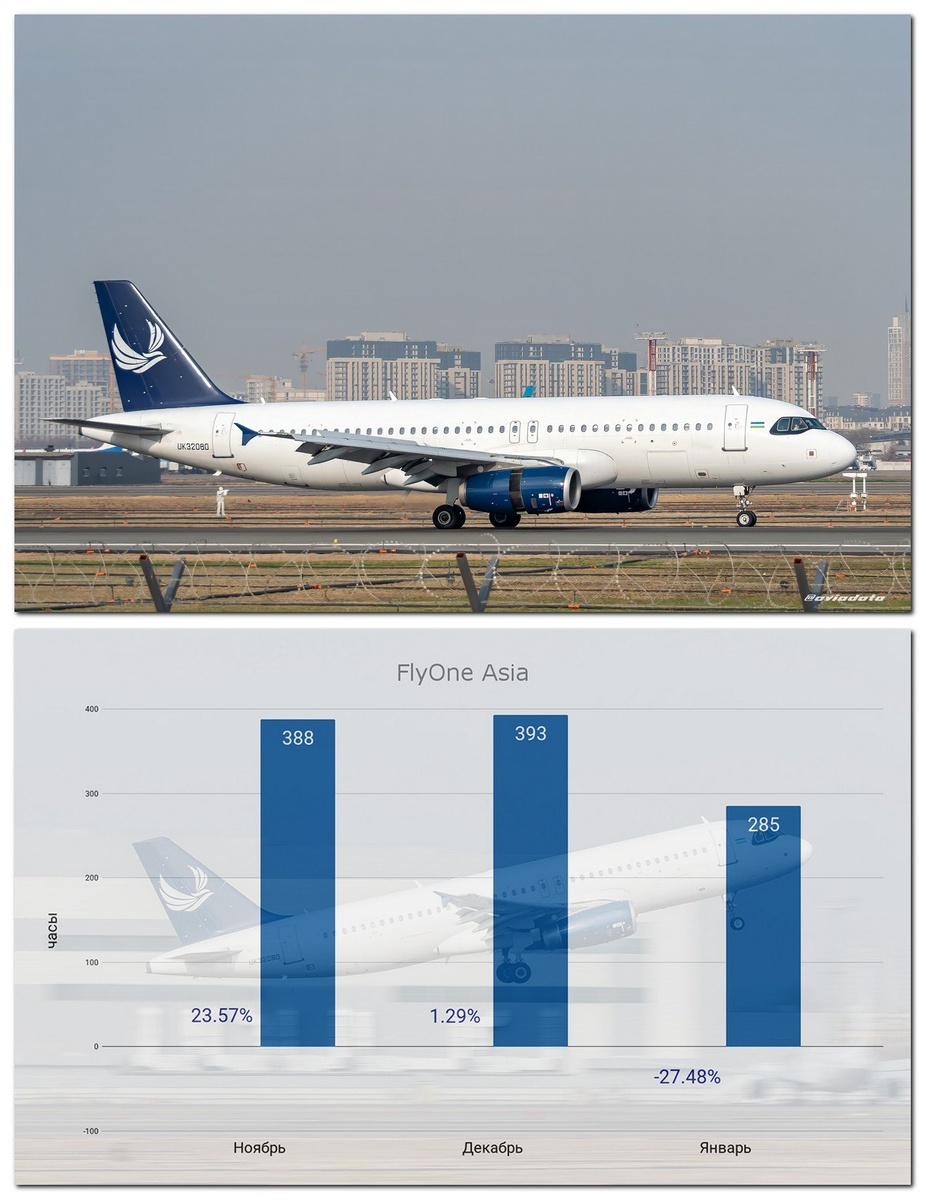 В январе единственный самолёт авиакомпании отправился на техническое обслуживание в Иорданию, соответственно количество часов налёта стало меньше. Рейсы за авиакомпанию на условиях мокрого лизинга продолжают выполнять 3 Airbus A320 - ER-00008, ER-00010, YR-FIA и Airbus A321 - ER-00001 авиакомпании FlyOne. Количество часов налёта самолёта авиакомпании FlyOne Asia за январь уменьшилось 🔽 на 27.48% по сравнению с декабрём и составило 285 часов. Общая динамика за последние 3 месяца представлена на графике. #статистика #flyoneasia #январь2026