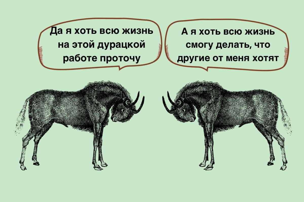 Вот например, чтобы много лет работать на нелюбимой работе, нужно иметь любимое хобби или большую мечту, потому что даже самая крепкая сила воли не выдержит многолетнего пресса и совершенного отсутствия энергии. Нет, конечно, чисто механически и в сопровождении целого списка психосоматики он так может хоть всю жизнь прожить - на нелюбимой работе, с нелюбимым образом жизни и в окружении нелюбимых людей. Кто ему помешает? Но и про качество жизни (хоть эмоциональное, хоть физическое) стоит тоже понимать. И внешне решение кажется максимально простым: «ну ты просто найди себе хобби, чё сложного». А сложно во всей этой ситуации как раз то, что многолетнее игнорирование собственных желаний приводит сначала к их постепенному затуханию, а далее и вовсе потери навыка их слышать. И чтобы хоть как-то эту задачку решить, давайте обратимся к теории. Самый сок заключается во внутреннем конфликте между оно, я и сверх-я: благодаря первому у нас есть внутренние силы хоть что-либо в этой жизни делать,
