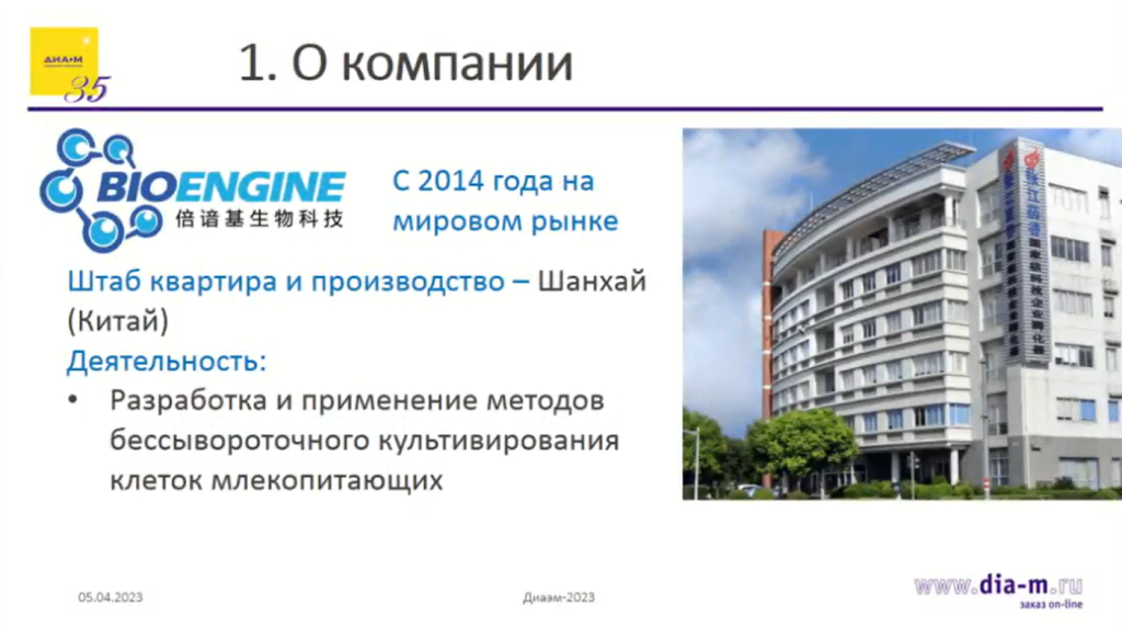 Компания Bioengine со штаб-квартирой в Шанхае — это крупный китайский производитель бессывороточных сред для культивирования клеток. Здесь целенаправленно занимаются разработкой и применением методов бессывороточного культивирования клеток млекопитающих: у компании есть не просто производственная база, а еще и целый научно-исследовательский центр разработки, в котором трудится большой коллектив, проводя работу в разных направлениях. Линейка продукции компании постоянно обновляется и совершенствуется, а список их партнеров с 2014 года только растет. С 2022 года компания пришла и на российский рынок.