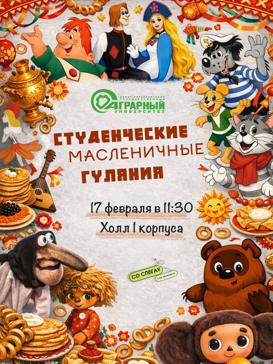 ! 🥞 Приглашаем вас принять участие в традиционных масленичных гуляниях. В программе мероприятия: Праздничный концерт с участием творческих коллективов; Интерактивные зоны и мастер-классы от студенческих отрядов; Силовое состязание «Перетягивание каната»; Смотр-конкурс студенческих подворий институтов СПбГАУ. Дата проведения: 17 февраля 2026 г. Время: 11:30 — 14:00 Проводим зиму вместе ярко и весело!