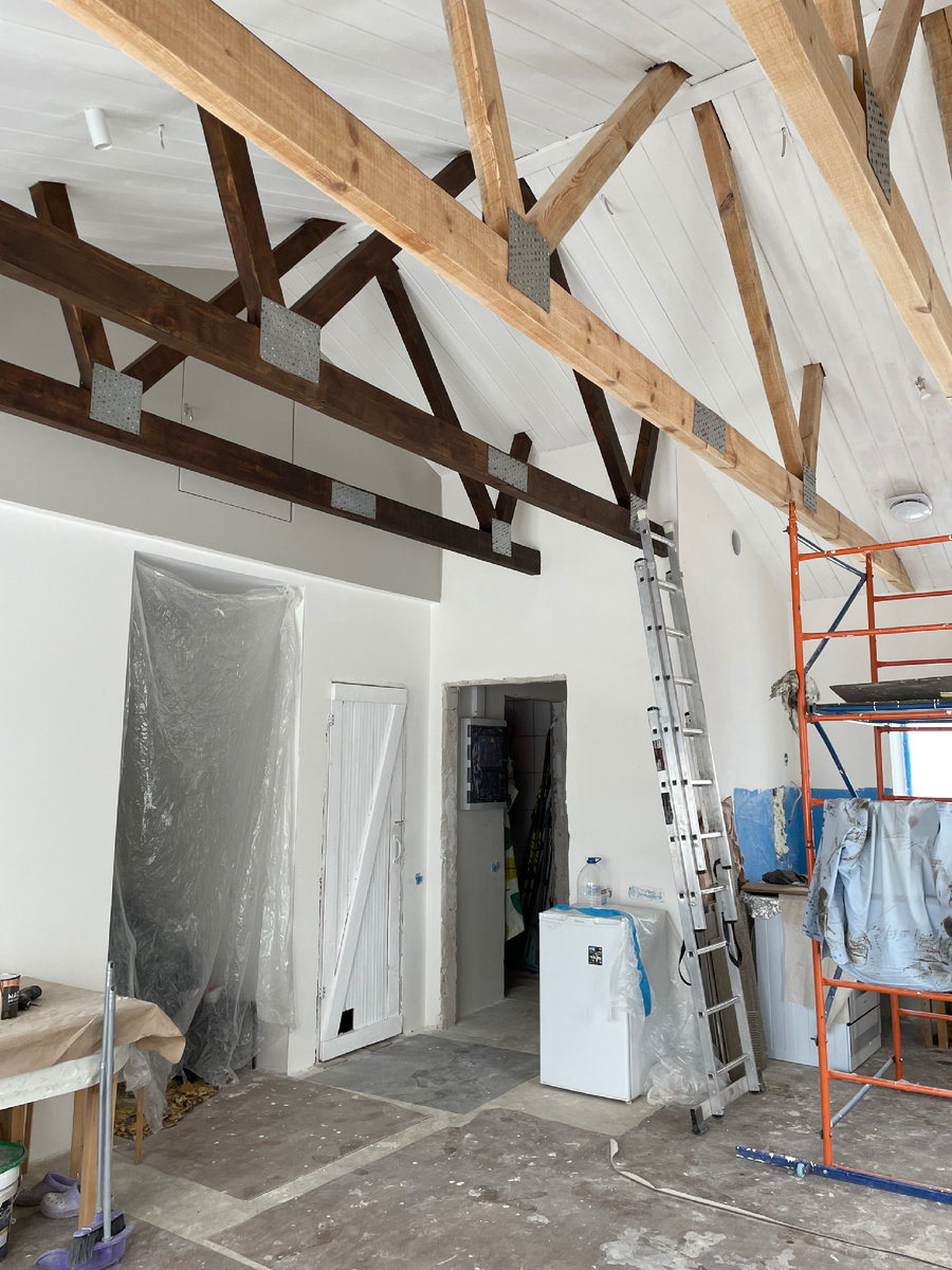 Понемногу движемся с окраской. Ну как движемся, супруг в основном красит потолок, балки и верхнюю часть стены. С меня уборка, да разве что откосы покрасила, я там достаю.