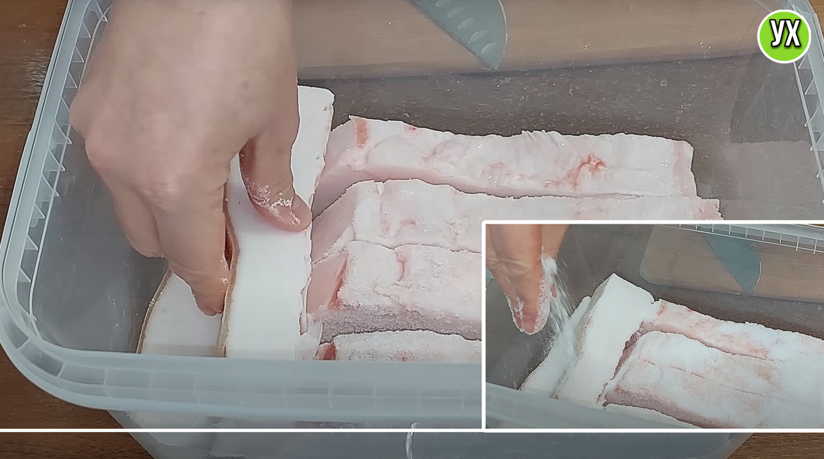РЕЦЕПТ 1: Сало сухого посола (классическое, но с изюминкой) соль сало специи по вкусу и желанию чеснок 1. Я выбираю светлое, белое сало - оно получается самым вкусным Сало нарезаю пластинами по 5-6 см, такими кусочками потом удобно нарезать на стол. 2. Беру контейнер, на дно насыпаю щедрый слой соли. Каждый кусок сала хорошо обваливаю в соли и выкладываю в контейнер. Сверху снова щедро засыпаю солью - сало лишнего не возьмёт. Накрываю крышкой и убираю в холодное место на 3 дня. 3. Через 3 дня: Достаю сало, полностью счищаю старую соль. Контейнер вытираю насухо. Снова на дно насыпаю соль, выкладываю куски сала, засыпаю свежей солью. Убираю в холодное место ещё на 2 дня. После этого сало готово. Получается мягкое, нежное, тает во рту. Хранится долго, можно держать и в холодильнике, и в морозилке. Но это еще не всё! Я его усовершенствую! 4. Достаю сало из контейнера, промываю под проточной водой, чтобы смыть лишнюю соль. Обсушиваю. Натираю специями - вот такой смесью: - несколько зубч
