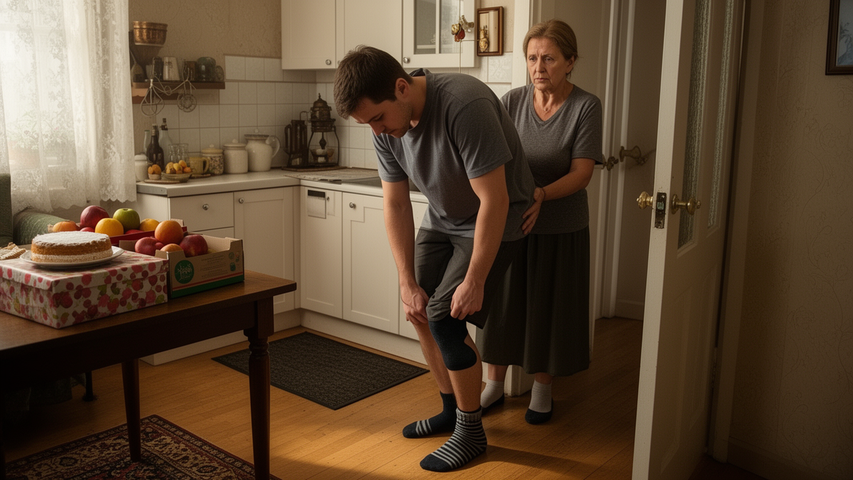 Саша опустил коробки на тумбочку, аккуратно, чтобы не помять. Потом снял ботинки, но сделал это так, будто выполнял чужую просьбу, которая ему неприятна. Носки действительно были разные: один тёмный, другой с полоской. Он быстро подтянул штанины, как будто это могло скрыть.