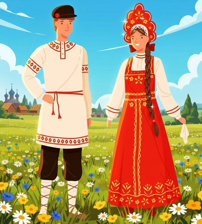Познакомить зрителей с богатым наследием русского народного костюма, его особенностями, символикой и региональными отличиями. Ведущий 1: Добрый день, дорогие друзья! Сегодня мы приглашаем вас в путешествие сквозь века, в мир, где каждая ниточка, каждая вышивка рассказывает свою историю. Мы поговорим о чем-то очень близком, но порой забытом – о русском народном костюме. (Музыка стихает.) Ведущий 1: Национальный костюм – это не просто одежда. Это зеркало души народа, летопись его жизни, отражение его веры, мечты и красоты. И среди множества национальных одежд, русский народный костюм выделяется своей особой статью, богатством красок и глубиной смысла. (Из-за кулис выходят два человека в красивых русских народных костюмах: девушка в сарафане и кокошнике, юноша в рубахе-косоворотке и порты.) Разве это не настоящее воплощение красоты и силы? (Музыкальный номер) Ведущий 1: Но знаете ли вы, как рождалась эта красота? Давайте разберемся, как складывался русский костюм. (На сцену выходит Ведущи