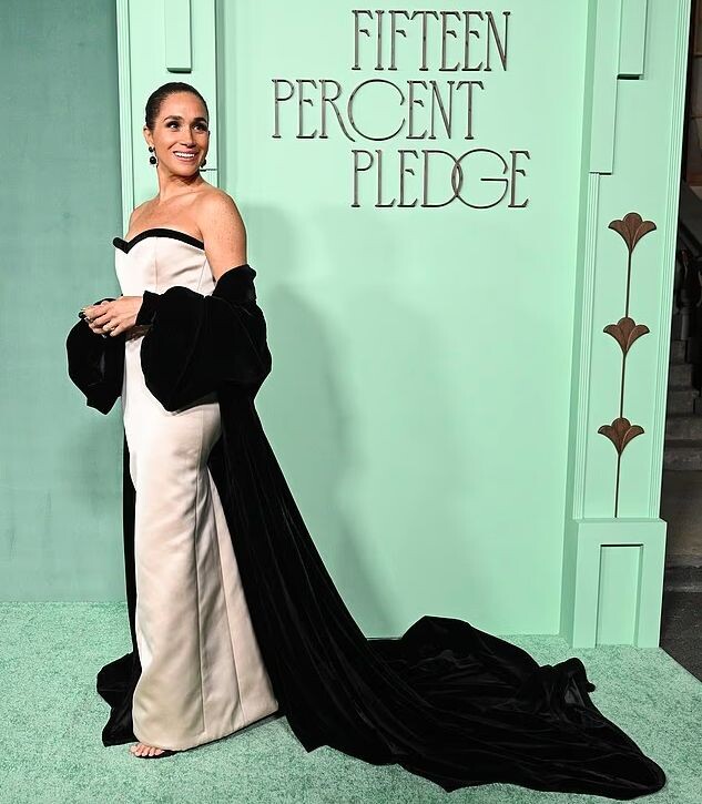 Пока принц Гарри старательно рекламирует шоколадки, его супруга выгуливает наряд на красной ковровой дорожке. Для своего сольного выхода 44-летняя Меган Маркл выбрала эффектное платье-бюстье нежно-розового цвета с вырезом в форме сердца. Главной изюминкой наряда, созданного на заказ нью-йоркским дизайнером Чарльзом Харбисоном, стал контрастный черный бархатный шлейф, который драпировался на плечах, добавляя образу драматичности и шика. Свой образ герцогиня дополнила винтажными украшениями с ониксом и бриллиантами, замшевыми туфлями и собрала волосы в свой фирменный тугой пучок. Выбор дизайнера не был случайным. Мероприятие, которое посетила Меган, было посвящено поддержке бизнеса, принадлежащего темнокожим. Организация Fifteen Percent Pledge призывает крупные компании выделять не менее 15% своих торговых площадей для таких брендов. Появившись в платье от темнокожего дизайнера, Меган, по мнению американских СМИ, продемонстрировала свою поддержку этому движению. На гала-вечере чествовали