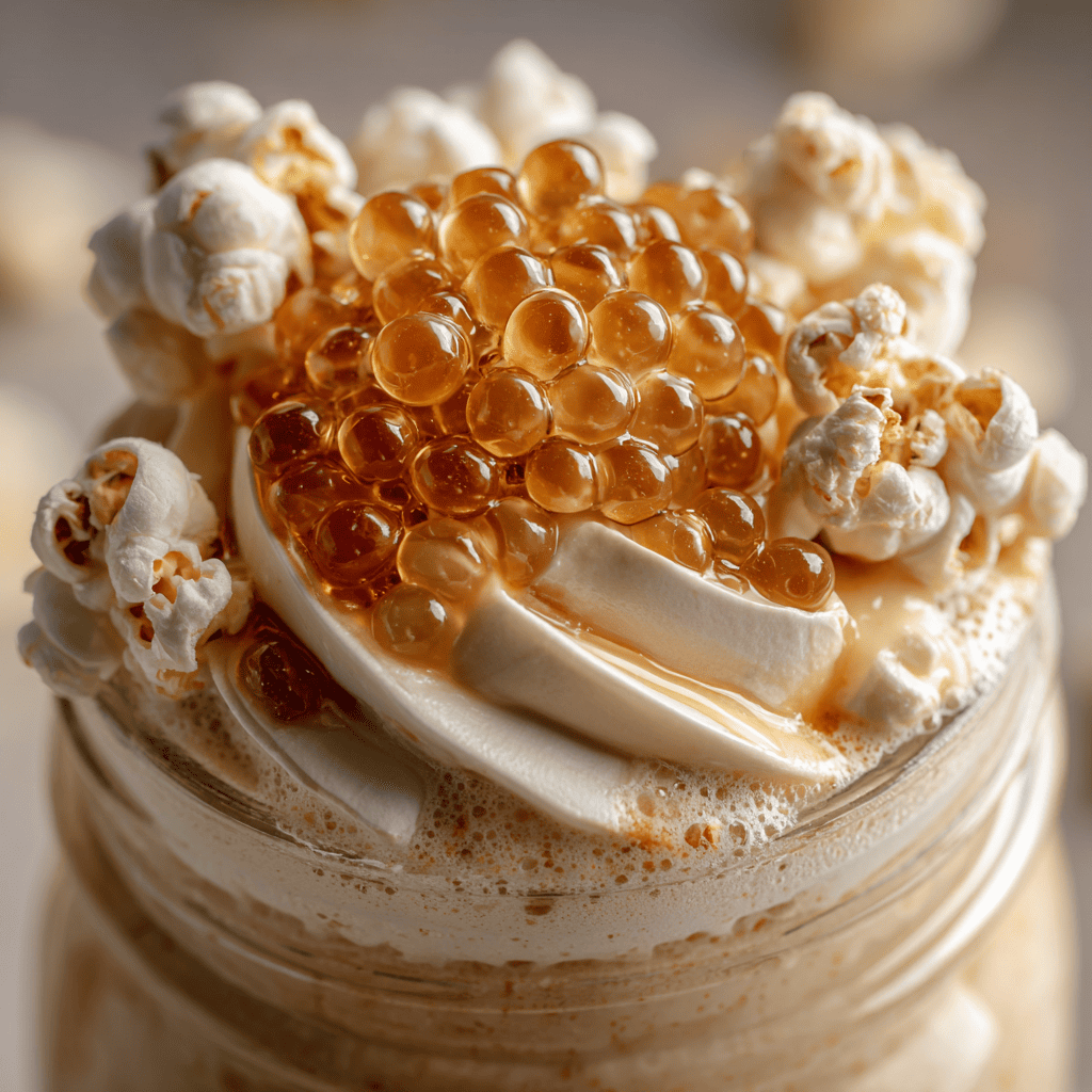 Забудь всё, что ты знал о милкшейках. «Попкорн Взрыв» — это не напиток, а вызов твоим вкусовым привычкам. Хрустящий попкорн в карамели, нежные ванильные джус‑боллы и облако сливок создают комбинацию, которая звучит как безумие, но на деле превращается в гастрономический шедевр. Это десерт, который не просто утоляет жажду — он заявляет о себе громко и ярко, как фейерверк в бокале. В блендер положите мороженое, молоко, 30 г карамельного попкорна и карамельный сироп. Взбивайте до однородной консистенции. На дно бокала выложите ванильные джус-боллы, посыпьте щепоткой