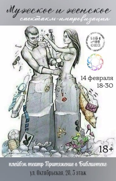 #Липецк Плейбэк-театр "Притяжение" в перформансе "Мужское и женское" Начало в 18:30 Давным-давно человечество захватил миф о романтической любви. Согласно ему влюблённые — две половинки единого целого. Разлученные разгневанными богами, ищут половинки друг друга, скитаясь по миру. Мужское ищет женское, а женское томится по мужскому... А вы тоже верите в существование родственных душ? Или свое счастье можно выковать самому? А может быть мужское и женское внутри вас в такой гармонии, что вы выбираете одиночество? Мужчины и женщины - какие мы? Каковы наши привычки, ожидания, взгляды на отношения? Противостояние или творчество, свобода или ответственность? Жизнь, похожая на праздник, или серые будни, в которых мы терпеливо создаем друг друга? Обо всем об этом (и не только) на нашем перформансе в уютной Библиотеке. Адреc: Липецк, улица Октябрьская, 28 Культурное пространство "Библиотека" Билеты: от 500 рублей Регистрация по ссылке Количество мест ограничено. #Притяжение #Перформанс #