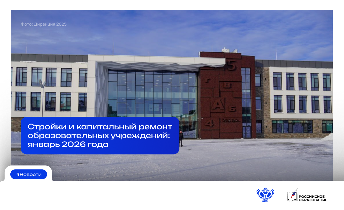 Существует добрая традиция – начинать всё хорошее с понедельника или первого числа. По праву первого месяца в году январь перехватил эстафету и задал тон на год вперёд: детские сады, школы, учреждения среднего профессионального образования по всей стране встретили ребят, вернувшихся с праздничных каникул, уютными коридорами, новенькими партами и просторными кабинетами с самым современным оборудованием. Приглашаем в путешествие по адресам, где будущее уже наступило: от Ленинградской области до Алтайского края были построены новые школы и корпуса, а также были отремонтированы уже давно знакомые и любимые.