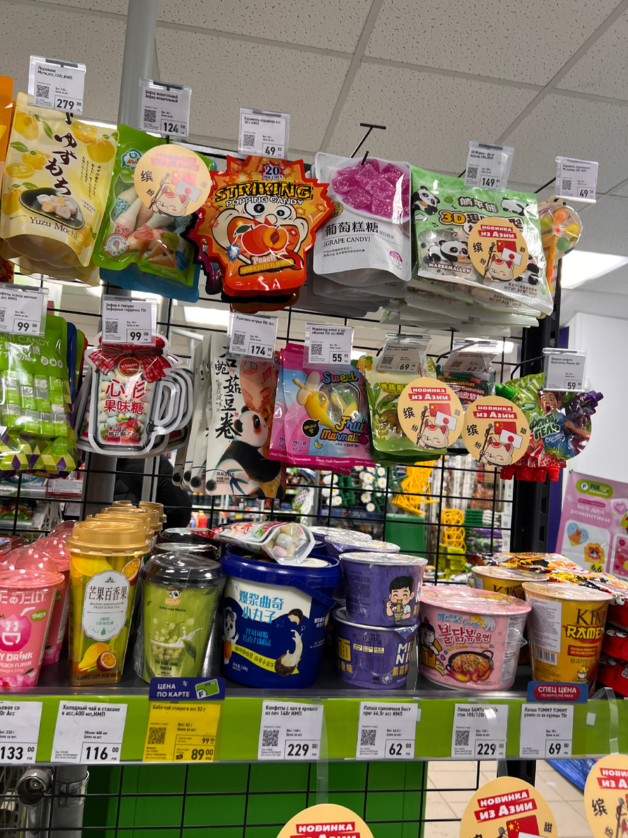 Полка с азиатскими сладостями выглядит так, будто тут открылся портал в «вкусненько, но непонятно» 🍬🌏.