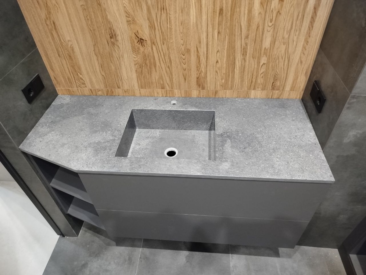 - Столешница под раковину. Практично истильно — не боится брызг и химии.