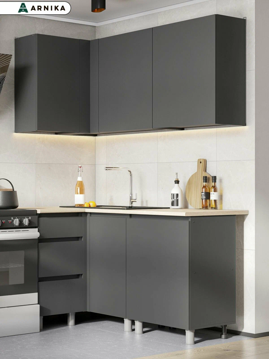 ARNIKA Кухонный гарнитур угловой Довер без столешницы - это стильный дизайн и функциональность в одном решении. Благодаря угловой конструкции размером 100х148см и графитовому цветовому исполнению, этот гарнитур идеально впишется в современный интерьер кухни.