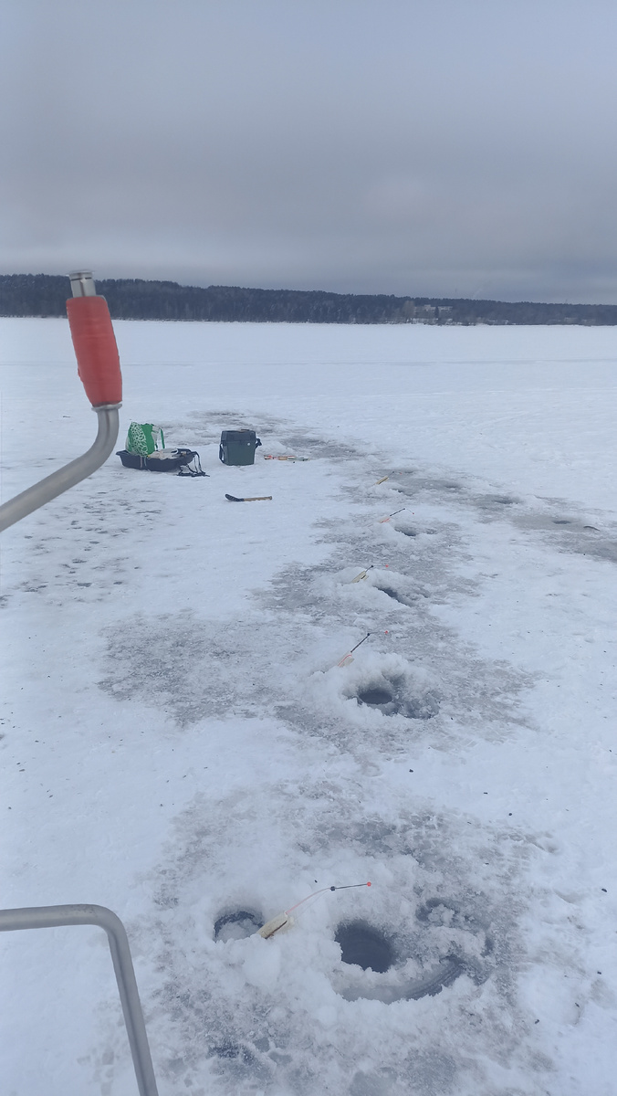 И дальше потихоньку пошло и у меня, причем еще лучше стал клев, когда я разрезал на наживку свежую корюшку. Темп правда не очень высокий, но временами все четыре удочки, стоявшие на глубине, оказывались наверху. Контрольная удочка на 17 метрах така и продолжала молчать.