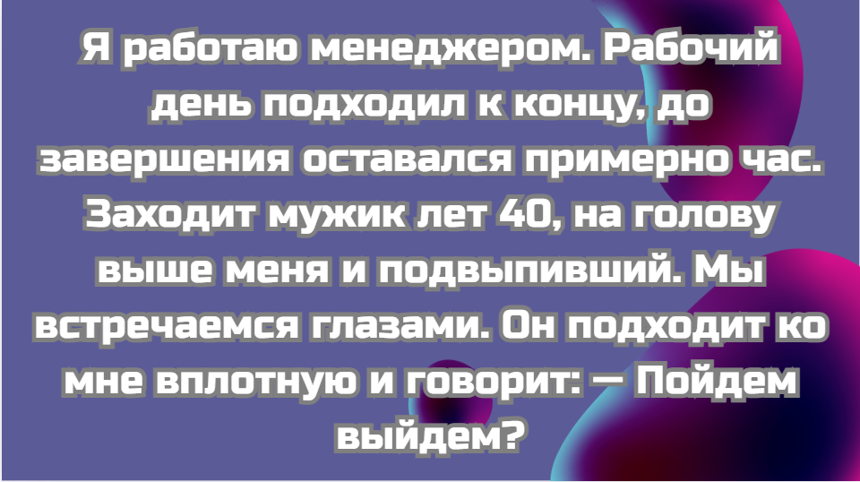 © Елена Акодус - Я работаю менеджером. Рабочий день подходил к концу, до завершения оставался примерно час. Заходит мужик лет 40, на голову выше меня и подвыпивший. Мы встречаемся глазами. Он подходит ко мне вплотную и говорит: