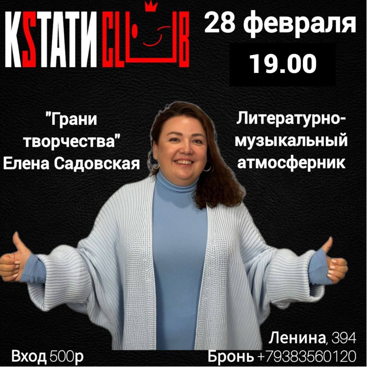 ! В этот вечер представлю вам грани своего творчества. Песни разных жанров, стихи, сказки... Скучно не будет! Место проведения: Кстати клуб, ул.Ленина, д.394. Бронируйте столики по номеру телефона: +79383560120.