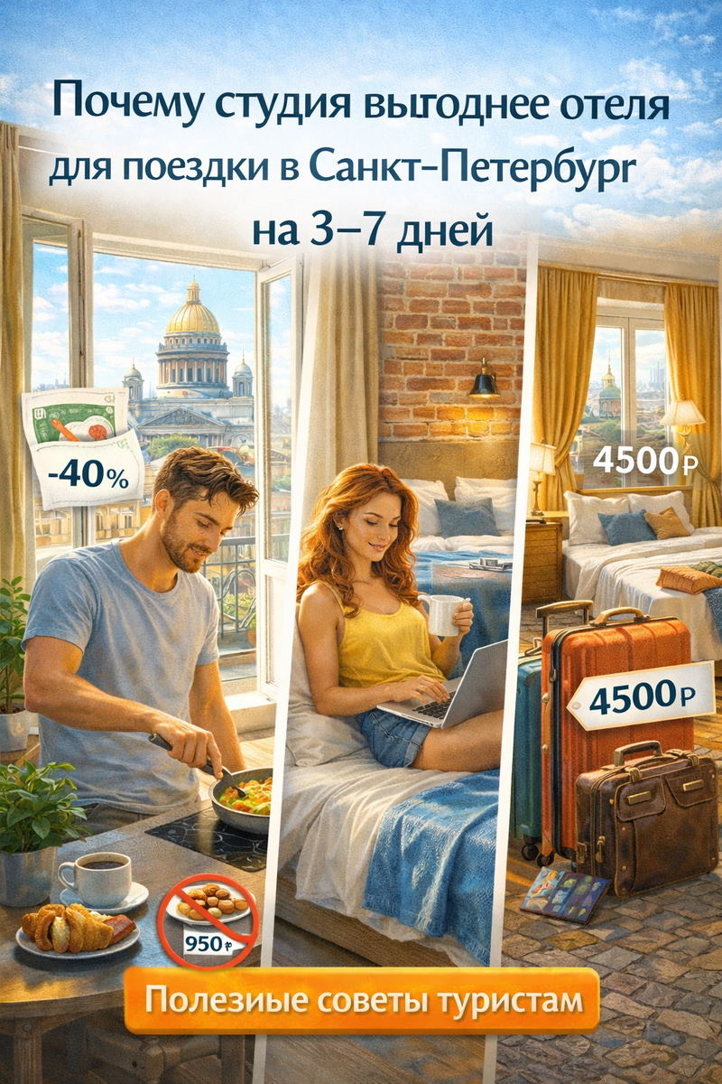 А чтобы понять, как выгодно распределить бюджет на жильё и впечатления, прочтите наше исследование: «Снять студию в центре Петербурга: цена vs удобство — реальный расчёт для туриста».