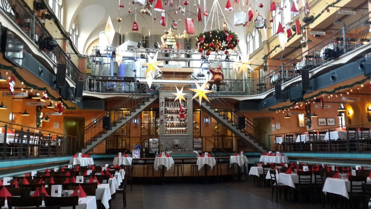 Есть в Германии прекрасный город Вупперталь, известный тем, что там родился Фридрих Энгельс (который с Карлом Марксом) и тем, что там располагается уникальная Вуппертальская подвесная монорельсовая дорога. Среди любителей пива в целом и немецкой кухни в частности Вупперталь также известен рестораном с необычным расположением в чаше бассейна. Называется этот пивной ресторан весьма незамысловато - Wuppertaler Brauhaus, или если по русски, то Вуппертальская пивоварня, из чего следует, что пиво они варят сами. Где-то до семидесятых годов прошлого века в этом здании располагался обычный городской бассейн, но потом то ли он совсем износился, то ли просто что-то новое и более прогрессивное в плане бассейностроения построили, но бассейн стал не нужен и его решили не сносить, а перепрофилировать и использовать архитектурные особенности бассейна для создания необычной концепции пивного ресторана. Оставили объем чаши бассейна, расставив там столики, оставили лестницы на вышки для прыжков в вод