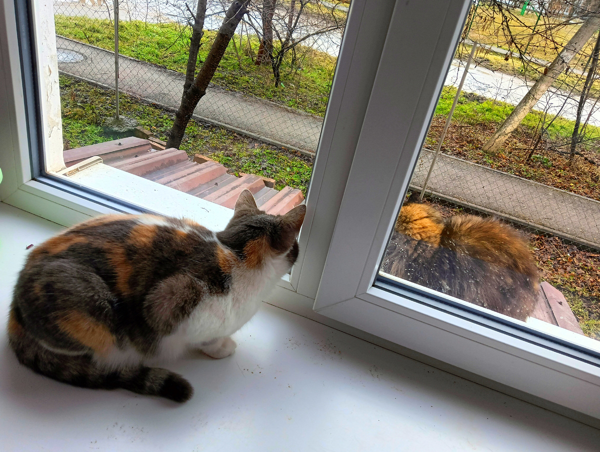 Машка по утрам дежурит на окне, не хочет запускать Маняшу в комнату. Когда я открываю окно, чтобы Манечка зашла в дом, Машка на неё кидается не на шутку, а в серьёз.