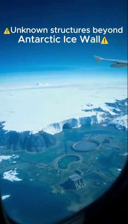 В сети ходят кадры англоязычного видео, утверждающего, что сделаны они в Антарктиде. При этом надпись на титрах фильма гласит, что это «Неизвестные сооружения за ледяной стеной Антарктиды». Надеюсь, вы видите часть крыла современного самолета, через иллюминатор которого, вроде как ведутся эти съемки. Вот только обратите внимание на тот факт, насколько нелепы эти явно сгенерированные с помощью ИИ изображения. Во-первых, сама линия этой «ледяной стены» весьма нелепая. Тут и огромный «каменный тоннель», из которого вытекает целая река, и какая-то нелепая плотина, ее перегораживающая. А уж имитация «крепости-звезды» вообще отвратительная по своим глупым и абсурдным архитектурным и фортификационным формам, объяснить которые не сможет даже сгенерировавший изображения ИИ. Далее, с другой стороны в эту якобы «крепость-звезду» упирается еще одно русло реки, которое через сотню метров другим своим концом упирается в эту «ледяную стену». Разве может такое быть в нашей реальности, подчиняющ