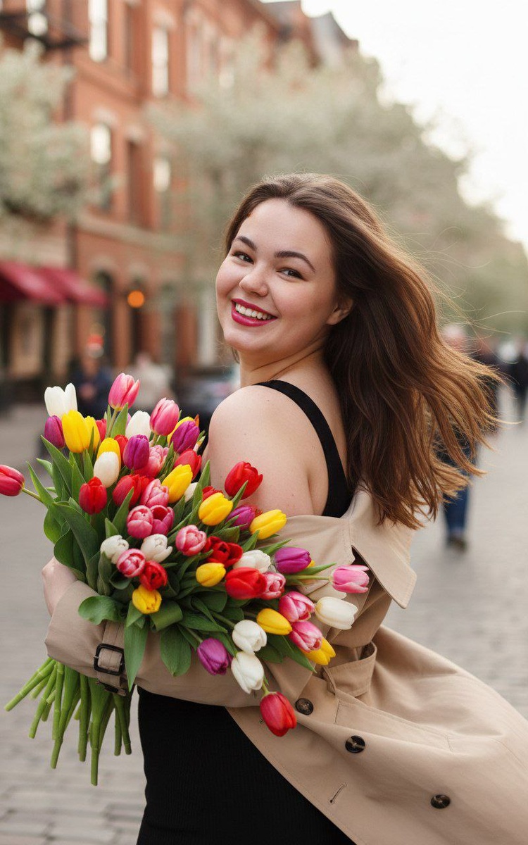 😀Выбираем "нейросети" 😀Нажимаем "Nano Banana" 😀Нажимаем "Nano Banana Pro" 😀Прикрепляем через скрепку свое фото и выбранный промпт 😀Наслаждаемся результатом😍 Динамичный портрет девушки, идущей по весенней улице, в руках огромная охапка разноцветных тюльпанов. Лицо крупным планом, она оглядывается через плечо с улыбкой. Макияж: акцент на губы цвета сочной малины, чистая сияющая кожа. Одежда: бежевый классический тренч, накинутый на плечи, и черный топ. Динамика: волосы развеваются на ветру, полы тренча в движении, задний план города слегка размыт (bokeh). Естественное дневное освещение, реализм, 8k, shot on Fujifilm. #женские@annapromtii20