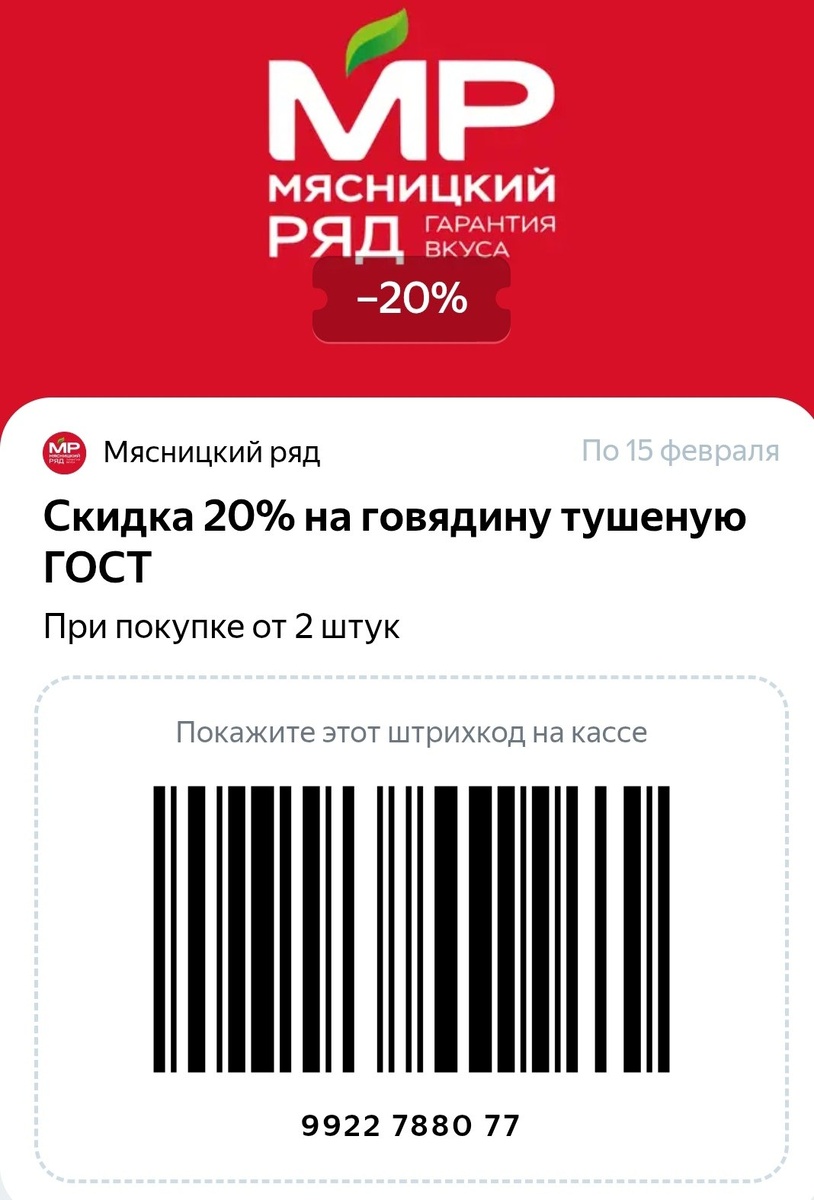 Мясницкий ряд скидка 20%на говядину тушуную ГОСТ, на кассе при покупке от 2 штук. До 15 февраля