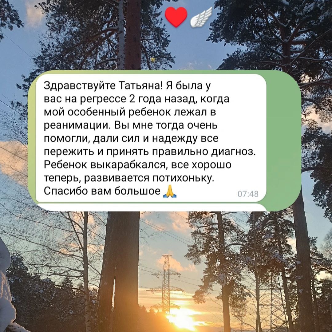 Дорогие, благодарю, что пишите об этом, мне важно это знать. Рада быть полезной ❤️🙏 Для записи на сеанс регрессии и регрессивной гипнотерапии: Меня зовут Татьяна, я дипломированный регрессолог, гипнотерапевт провожу сеансы регрессии в прошлые жизни и к Высшим аспектам. Помогаю найти корень вашей проблемы, чтобы проработать его и исцелить психотравму. Работаю с любым запросом. А также делаю нумерологические расклады по методу Матрица судьбы. Практикую с 2020 года на постоянной основе. Буду рада стать вашим проводником в этот удивительный опыт. Провожу очень бережно обладаю сильной эмпатией и чувствованием клиента-регрессанта. Провела более 1000 сеансов. Больше информации в подборках, а также по ссылкам: Обо мне и чем я могу быть вам полезна Подробнее о регрессии Регрессия с проработкой Регрессия на основе метода Долорес Кэннон Матрица судьбы (нумерология) Сеанс регрессии через проводника Нику (без вашего личного погружения) Пакет регрессий из трех сеансов 🗝️ Родовая регрессия Регр