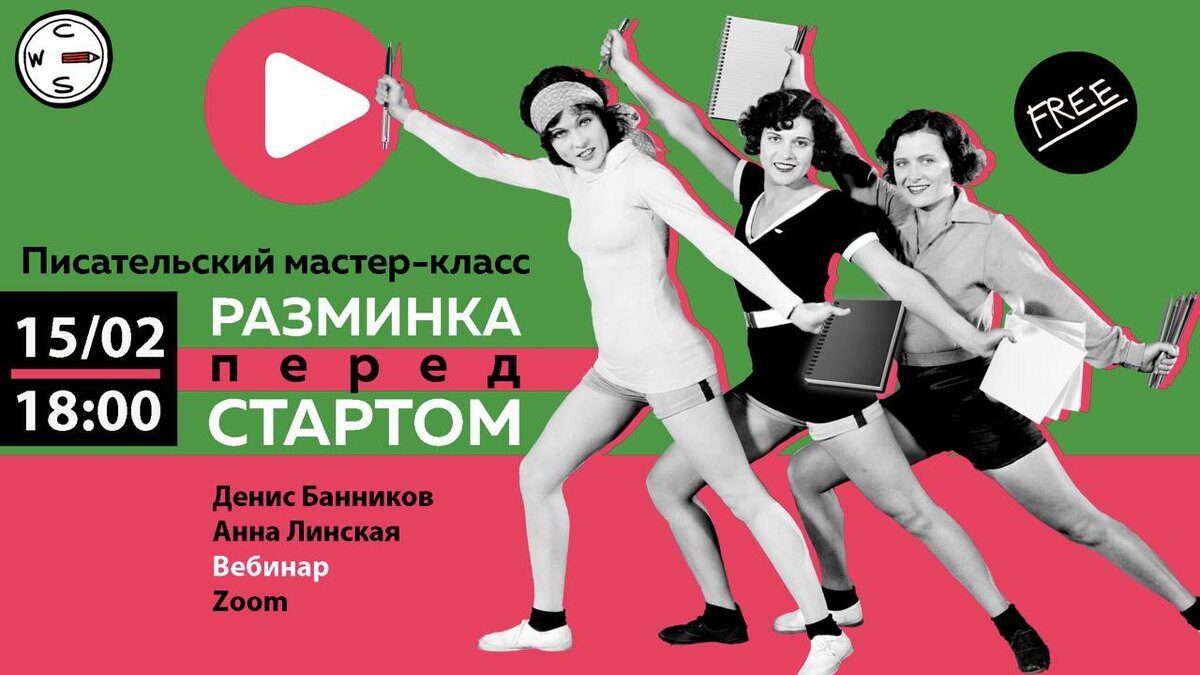 Погладить перед химчисткой. Погуглить симптомы перед походом к врачу. Размяться перед стартом! Перед началом обучения так и тянет сделать еще что-нибудь полезное: перечитать все книги по писательскому мастерству, посмотреть десяток интервью любимых авторов — в конце концов, найти ту самую волшебную таблетку, которая наконец позволит писать «как надо». Но в итоге старт снова откладывается... Забудьте про лишние движения — просто приходите на бесплатный разминочный мастер-класс Анны Линской и Дениса Банникова 15 февраля в 18:00. ➡️Если вы часто бросаете текст на первых страницах, не знаете, с чего начать, или боитесь писать «неправильно» — этот мастер-класс для вас. Вместе с постоянными мастерами CWS Денисом Банниковым и Анной Линской мы разберемся, как запустить процесс письма, преодолеть страх чистого листа и немного утихомирить внутреннего критика. Поговорим о том, почему вдохновение — не обязательное условие для работы, и как идеи рождаются из обыденности: личных событий, наблюд