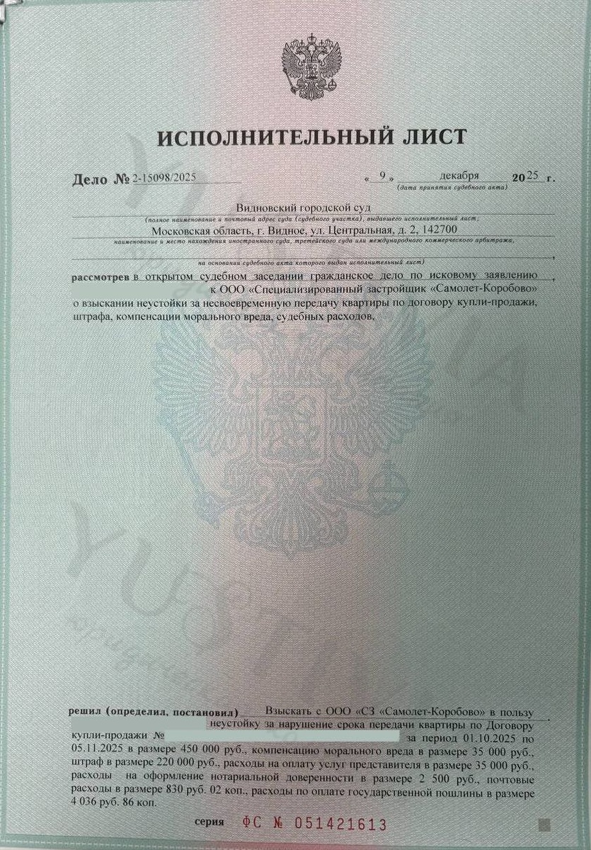 : ООО "СЗ "САМОЛЕТ-КОРОБОВО" ЖК: ГОРКИ ПАРК ➿➿➿➿➿➿➿➿➿ О взыскании неустойки за просрочку передачи квартиры по договору купли-продажи Видновский городской суд Московской области Дело: 2-15098/2025 Судья: Куприянова Я.Г. Площадь: 39,70 м² ➿➿➿➿➿➿➿➿➿ Взысканные суммы: ➡️Неустойка: 450 000; ➡️Моральный вред: 35 000; ➡️Штраф: 220 000; ➡️Суд. расходы: 42 366,88. ➿➿➿➿➿➿➿➿➿ 💸Итого: 747 366,88 рублей. ❤️Приёмка квартиры и строительно-техническая экспертиза за счёт компании! Лучше звоните Юсти🆗 ➿➿➿➿➿➿➿➿➿ 📞+7 (936) 333-33-48 ✅@Yustivia 🌐yustivia.ru ➕Яндекс услуги