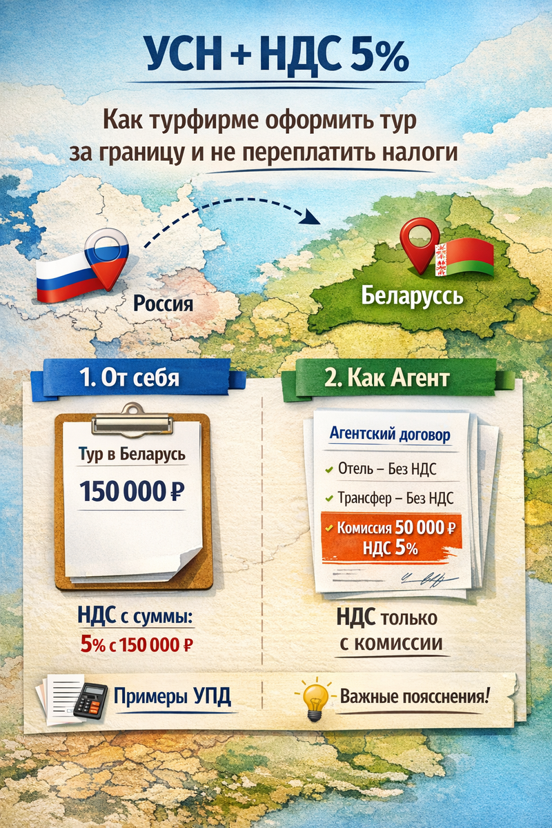 если выручка ИП или организации на УСН превышает 20 млн рублей, то они автоматически становятся плательщиками НДС. Однако, в отличие от общей системы налогообложения, им предоставляется право уплачивать НДС по пониженной ставке — 5% от выручки, без вычетов и без ведения раздельного учёта. Это касается всех регионов и распространяется на те виды деятельности, по которым законом предусмотрено такое право. Для турфирм — особенно актуально, поскольку: Казалось бы: услуги — не в РФ, значит и НДС не нужен? Не всё так просто. Вы оформляете договор от имени своей компании и берёте с клиента, например, 150 000 руб. за тур. Из этих денег вы оплачиваете отели, транспорт и питание за рубежом. Услуга: Организация тура в Беларусь, 3 дня Стоимость: 150 000 руб. В т. ч. НДС (5%): 7142,86 руб. 💡 Даже если физически турист отдыхает за границей — услуга организации оказана в РФ. Это и есть объект налогообложения. Вы заключаете агентский договор с белорусским парт