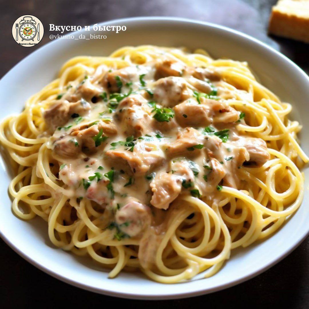 #ужин #30мин 🕒 Время приготовления: 30 минут Порции: 3–4 Сложность: легко 🧾 Ингредиенты: 🟠Куриное филе — 1 шт. 🟠Спагетти (или другая паста) — 400 г 🟠Сливки 10% — 200 мл 🟠Лук репчатый — 1 шт. 🟠Сливочное масло — 20 г 🟠Соль, перец — по вкусу 🟠Прованские травы — по вкусу 🟠Зелень — по желанию 🍴Приготовление: 1. Куриное филе отварите в подсоленной воде около 20 минут, остудите и нарежьте кубиками. 2. Лук мелко нарежьте и обжарьте на сливочном масле до мягкости. Добавьте курицу и прогрейте вместе пару минут. 3. Влейте сливки, перемешайте, накройте крышкой и тушите 3–4 минуты на слабом огне. 4. Спагетти отварите до состояния al dente, откиньте на дуршлаг. 5. Переложите пасту в сковороду с соусом, перемешайте. Добавьте прованские травы, перец и при желании свежую зелень. Подавайте сразу, пока соус нежный и кремовый. Вкусно и Быстро | Мы в Мах 📲