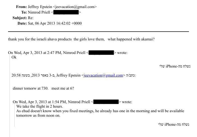 Новости про Эпштейна и его связи с Эхудом Бараком. Нимрод Приэль, сын Нили Приэль - супруги Эхуда Барака, в 2010 году отправил письмо Джеффри Эпштейну, в котором поблагодарил его за помощь при поступлении в престижный Нью-Йоркский университет (NYU). Приэль написал Эпштейну: "Я хотел выразить глубокую благодарность за ваши усилия в этом деле. Это действительно было моей мечтой, и я чувствую, что это большой шаг для достижения моих целей". НАСТОЯЩИЙ МАТЕРИАЛ (ИНФОРМАЦИЯ) ПРОИЗВЕДЕН, РАСПРОСТРАНЕН И (ИЛИ) НАПРАВЛЕН ИНОСТРАННЫМ АГЕНТОМ ГУРЕВИЧЕМ МИХАИЛОМ ЛЕОНИДОВИЧЕМ, ЛИБО КАСАЕТСЯ ДЕЯТЕЛЬНОСТИ ИНОСТРАННОГО АГЕНТА ГУРЕВИЧА МИХАИЛА ЛЕОНИДОВИЧА. В другом письме от 2013 года Эпштейн, судя по всему, благодарит Приэля за присланную продукцию компании "Ahava". "Девочкам она нравится", - отметил он, а затем поинтересовался: "Что происходит с Akamai?" (американская компания в сфере сетевых услуг и облачной безопасности). В других обнародованных письмах фигурирует довольно частое использование Э