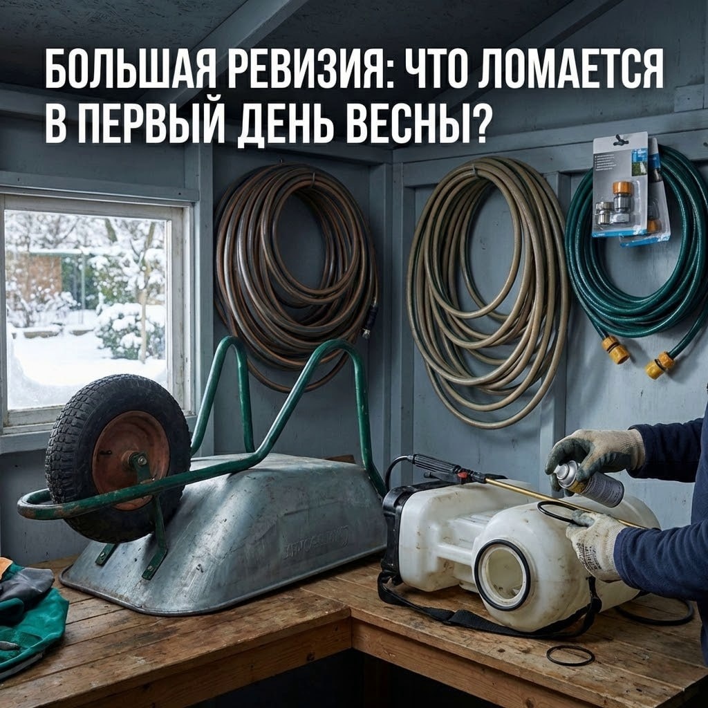 ? 🛠 Закон подлости: вы выходите в сад в первый теплый день, а опрыскиватель течет, и колесо у тачки спущено. Настроение испорчено, день потерян. Проверьте эти «слабые звенья» прямо сейчас, пока магазины запчастей пусты: 1. Опрыскиватели. Самая частая проблема — рассохшиеся резиновые прокладки и кольца. Смажьте их силиконовой смазкой или вазелином. Налейте воды и проверьте, держит ли давление клапан, не бьет ли струя в бок. 2. Садовая тачка. Шины за зиму часто спускают. Если резина потрескалась — камера «жеваная», лучше купить новую покрышку сейчас. Проверьте подшипник колеса: если он скрипит или заржавел, смажьте (WD-40, затем Литол) или замените. 3. Шланги. Если они хранились в неотапливаемом сарае, дешевый пластик мог потрескаться на сгибах. Разверните их, проверьте на заломы. Замените коннекторы (быстросъемы), если они треснули. Потратьте полчаса сегодня, чтобы весной просто взять и начать работать. На нашем канале — только полезная и проверенная информация! #подготовкасада