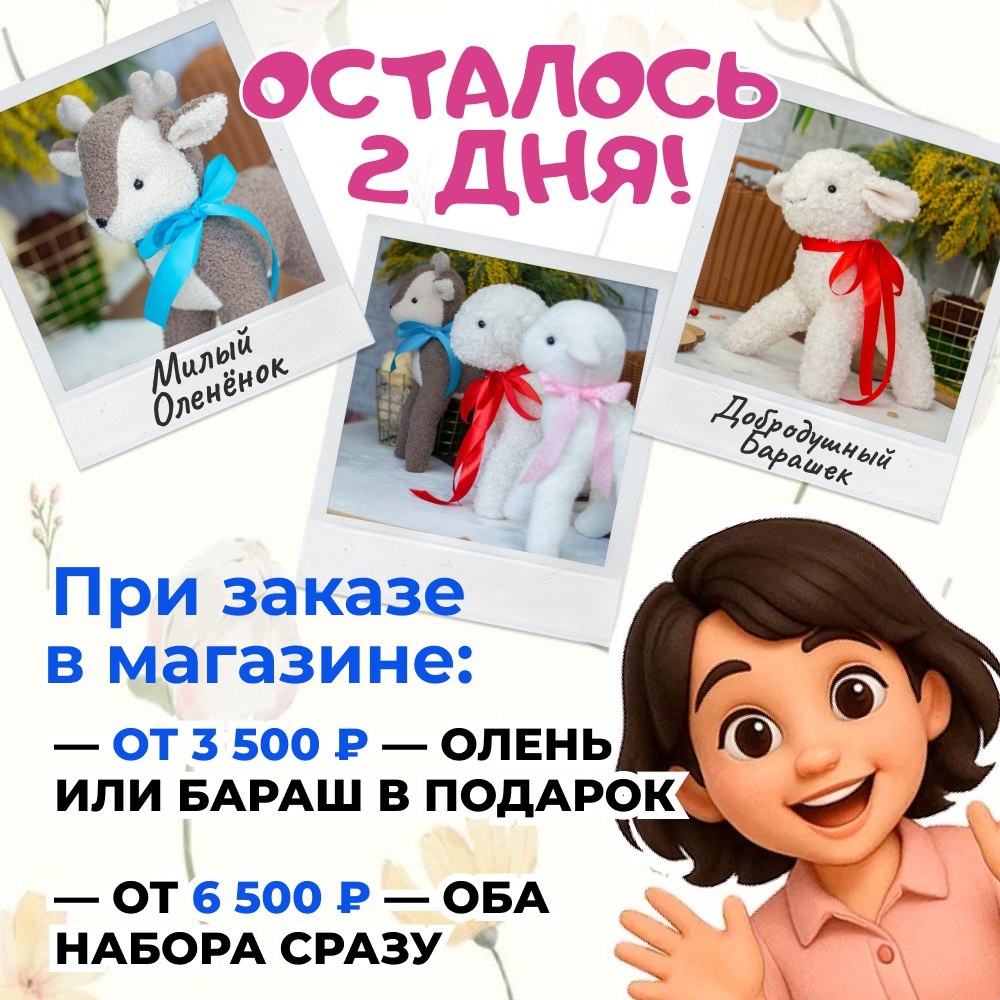 Если вы ещё думаете, то самое время перестать откладывать ⏰ Остается всего ДВА дня! Такая выгода и такие условия — 🔥 БОЛЬШАЯ РЕДКОСТЬ 🔥 🎁При заказе в магазине: — от 3 500 ₽ — Олень или Бараш в ПОДАРОК — от 6 500 ₽ — оба набора сразу * Вы получите НАБОР + УРОК + ВЫКРОЙКУ ЖМИТЕ 👉 https://art-tkani.ru/ Это полноценные, большие, стильные игрушки, которые сейчас в самом тренде. Не что-то маленькое, а: ✔ полноценный набор материалов ✔ печатная выкройка ✔ полный видеоурок, от начала до конца 🔥 Всё это — БЕСПЛАТНО, просто за заказ в магазине. Условия ещё действуют, но СКОРО ЗАКОНЧАТСЯ ❗ ⏰ Через 2 дня акция заканчивается. Потом — всё. Никаких продлений 👉 Чтобы выбрать персонажа, при оформлении заказа введите промокод: ОЛЕНЕНОК — если хотите Оленя БАРАШ — если хотите Бараша Если вы планировали покупать ткани или материалы — лучшего момента не будет. Забирайте свой набор сейчас, пока подарки ещё есть. ЗАБРАТЬ 👉 https://art-tkani.ru/
