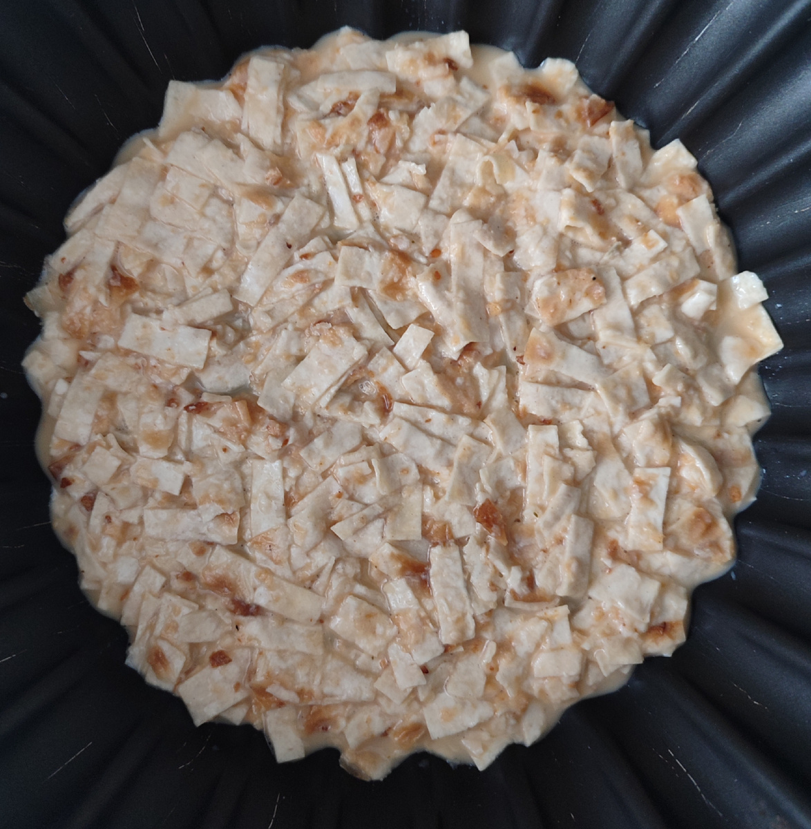 Затем взяла свою антипригарную форму и выложила прямо на сухое дно равномерным слоем "тесто".