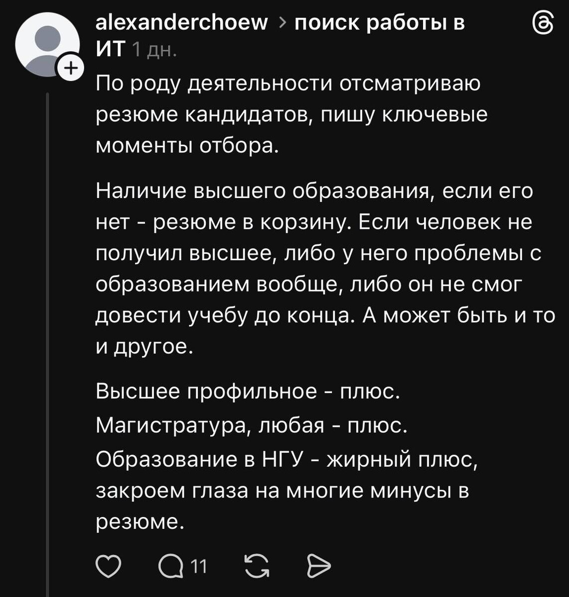 А вот этот НГУ закончил и плевать что на каждый экзамен по 5к в зачетке приносил. Но его мы на работу возьмем, он ведь закончил!