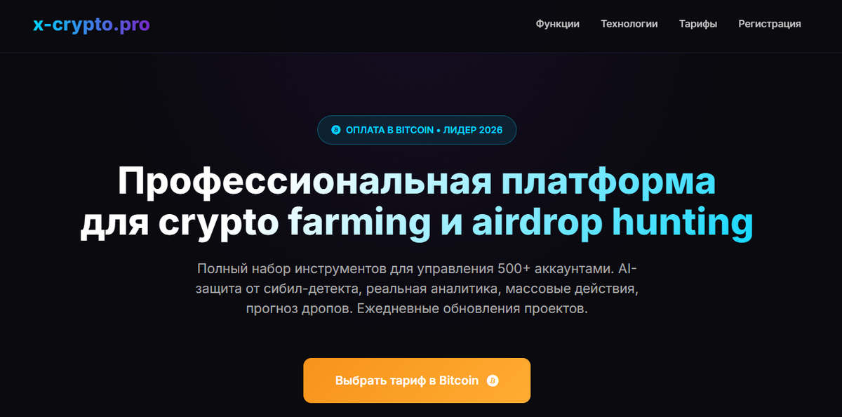 Перейти на автоматизированную платформу и начать фармить по взрослому - https://x-crypto.pro/ru/. Все инструменты в одном кабинете. Без абонентской платы. Пожизненный доступ. Ежедневные обновления. Круглосуточная поддержка.