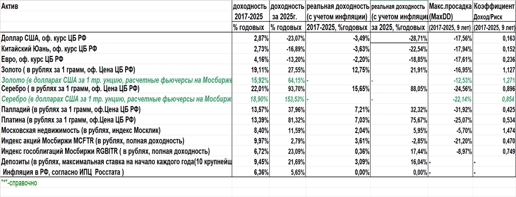 2025 год уже давно закончен, и на длительных каникулах, поскольку свободного времени полно, я решил подвести итоги прошедшего года по разным активам, доступным для инвестора в России. По сути, задача то несложная: посчитать доходности за 2025 год и сделать некий простейший рейтинг. Но не все оказалось так просто. Забегу вперед- анализировать пришлось период аж в девять лет. Представлю здесь результаты моих подсчетов, а заодно и мои мысли на эту тему. В этом материале не было задачи проводить глубокий анализ причин, приведших к таким результатам рейтинга. Просто подсчитал цифры и определил, так сказать, лидеров и аутсайдеров. Итак, результаты расчетов приведены в таблице 1 ниже.