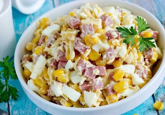 📖 Ингредиенты: - Копченая колбаса - 100 г. - Твердый сыр - 100 г. - Яйцо отварное - 3 шт. - Кукуруза - 0,5 банки - Майонез - по вкусу - Соль, перец - по вкусу 🧑🏻🍳 Приготовление: 1. Яйца, колбасу нарезать одинаковым не крупным кубиком. Сыр натереть на терке. 2. В глубокой чаше смешать все ингредиенты и заправить майонезом. При желании посолить и поперчить. Приятного аппетита!