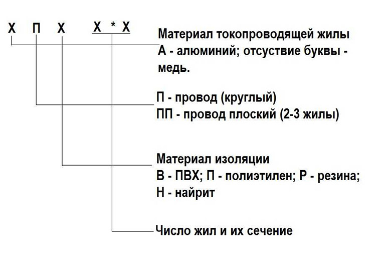 Провод представляет собой проводник, который состоит из одной-трех жил. Они заключены в оболочку из ПВХ, резины или полиэтилена. Сердечники чаще всего изготавливают из меди, но бывают токоведущие сердечники из алюминия. Они бывают цельными или многопроводными (в виде пучка из тонких медных проводников). Провода имеют простую конструкцию, поэтому маркировка содержит небольшое количество буквенно-цифровых обозначений. Кабели устроены сложнее, состоят из нескольких оболочек, поэтому маркеров используется больше. Первая буква - материал жилы. Вторая буква - вид провода: Третья буква - материал изоляции жилы: провода с дополнительной оплеткой, могут иметь обозначения: В некоторых изделиях изоляция защищена оболочками. Об этом говорит маркер после третье буквы. Если стоит «В», значит оболочка из поливинилхлорида, если «Н», то из найрита. Четвертая буква - особенности конструкции. Она может отсутствовать в маркировке, если перед вами самый простой провод. Улучшенные изделия могут быть с об