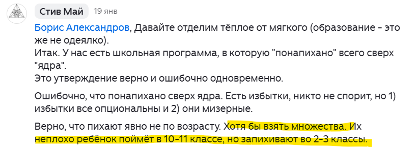 ...и вроде ясно, что пустое - а вдруг? Фольклор. Тут на днях один шибко грамотный, как я понимаю, мой коллега заявил, что кто-то кому-то "запихивает в 2-3 классы множества", а также - что те же множества "неплохо ребёнок поймёт в 10-11 классе". И вроде ясно, что он в комментариях это сгоряча ляпнул, не подумавши, но давайте подумаем эту мысль за него. Для начала, предположу, что имеется в виду под "запихивают в 2-3 классы": по моим воспоминаниям, Стив Май горячо и нежно любит учебники Петерсон, а в них, скорее всего, используется слово "множество". На пальцах, на доступном и понятном большинству учеников языке, без отклонений в реальную жизнь этих самых множеств, им излагают исключительно то, что они вполне могут понять. Пока я писал эту статью, выяснилось, что обсуждаемый товарищ вообще мало что смыслит в математике и преподавании, но тема у нас другая. Множества - штука очень абстрактная, абстрактное мышление хорошо развито далеко не у всех людей. И даже у тех, у кого оно в результат