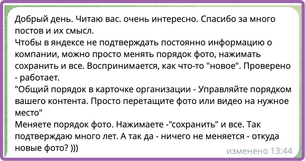 Чтобы, для подтверждения на Яндекс.Картах, не добавлять постоянно новые фотки для получения синей галочки - просто мешайте порядок старый :) бугага... Строгость требований разбивается как яички об дверь необязательности исполнения :) Русский ИТ бизнес