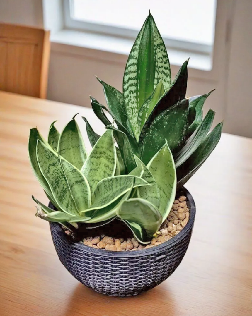 Итак, начнем потихоньку. Вот в этом горшочке у меня живут два сорта из Пятерочки. Та что темная с окаймлением предположительно Сансевиерия Ханни Сильвер Флейм (предположительно). Она выпустила высокие листья по сравнению с предыдущими. Деток пока нет. Интересно как она будет дальше расти. А та что яркая и низенькая это Ханни Крем. У нее растут три детки еще из магазинного состояния.