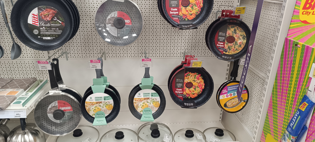 Настало время обновить наши сковородки на кухне. И за покупкой новой мы пошли в супермаркет Магнит, в нашем районе у них очень большой выбор сковородок.
