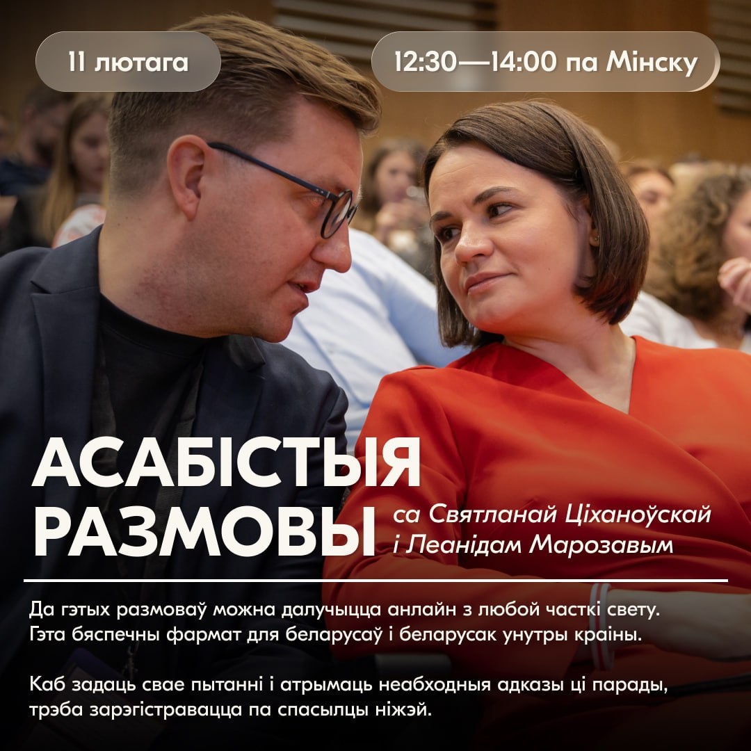 ! В эту среду, 11 февраля, Светлана Тихановская приглашает всех желающих на личные консультации. К этим разговорам также присоединится советник Светланы Тихановской по правовым вопросам Леонид Марозов. Если ваше вопрос связан с репрессиями, документами или правовым статусом за границей - это шанс прямо обозначить проблему человеку, который вместе с командой может заняться ее решением. Разговоры пройдут в среду, 11 февраля, с 12:30 до 14:00 по Минску. К разговорам можно присоединиться онлайн из любой точки мира. Это безопасный формат для белорусов и белорусок внутри страны. Чтобы попасть на разговор с Светланой, зарегистрируйтесь **по этой ссылке. **