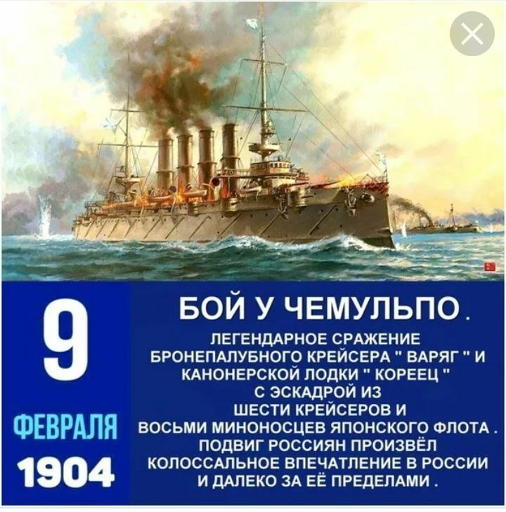 9 февраля 1904 года вблизи города Чемульпо (сейчас Инчхон) в Корее состоялось сражение между русскими крейсером «Варяг» и канонерской лодкой