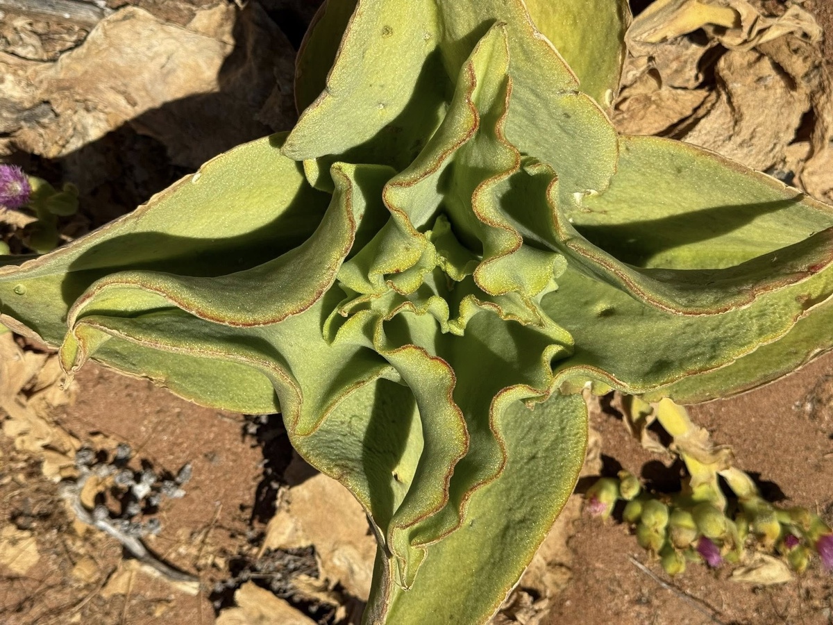 Этот кучерявый лопух - Mesembryanthemum barcley. Даже по фотографии чувствуется, какой он кожисто-жесткий. С первого взгляда, подумал было - каланхоэ, совсем не похож на "огородные" мезембриантемумы. Но род Мезембриантемум насчитывает более ста видов, которые вообще до возмутительного не похожи один на другой.