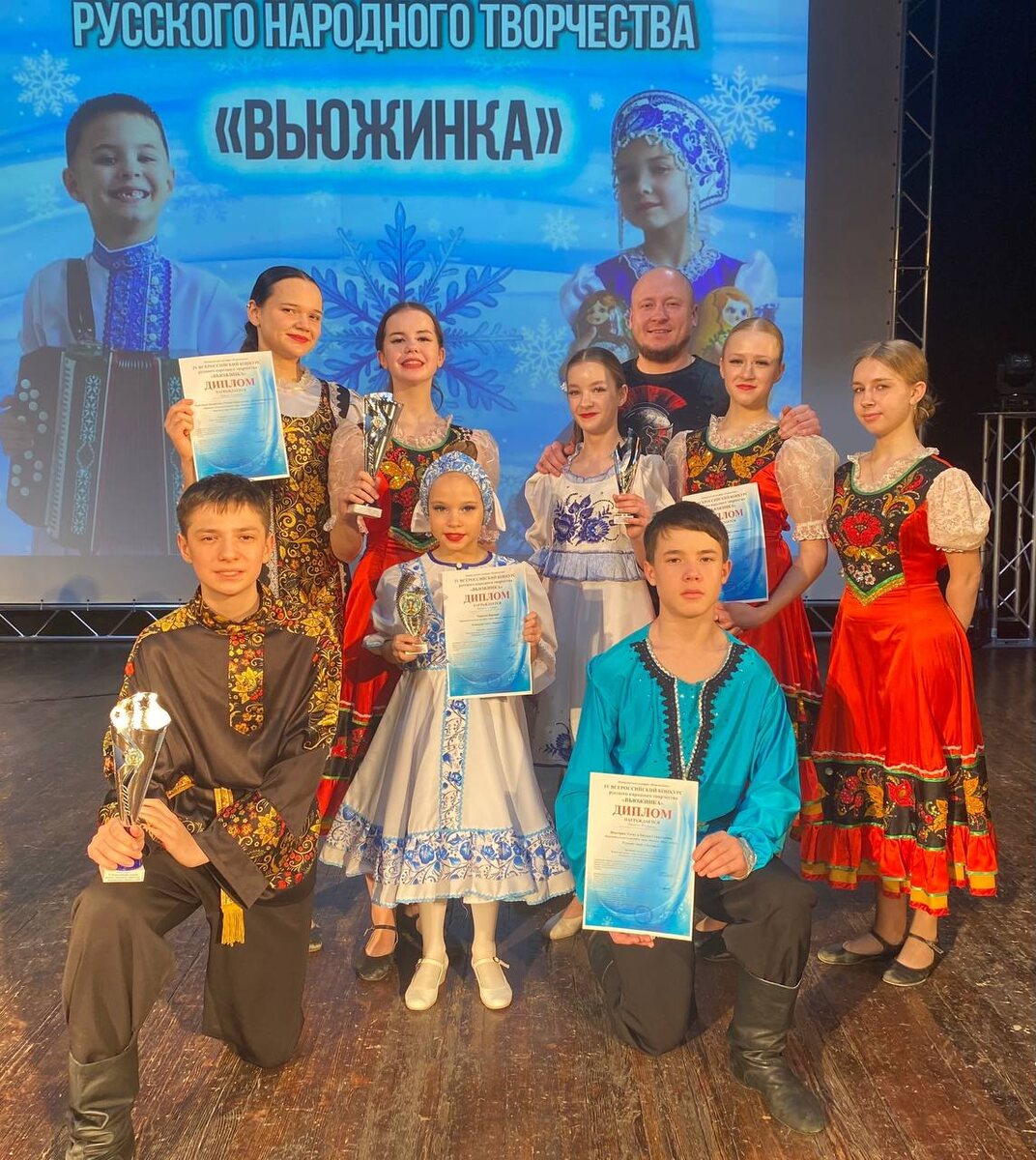 "! От всего сердца поздравляем вас с триумфом на IV Всероссийском конкурсе русского народного творчества "Вьюжинка"! Завоевать звание лауреатов первой и второй степени - это невероятный успех, высшая оценка вашему таланту, самоотдаче и бесконечному труду. Каждое движение, каждый образ, воплощённый на сцене, - это частичка вашей души, вашей любви к русской культуре и традициям. Ваша победа - это яркий праздник для всего нашего коллектива! Вы вновь доказали, что «Юность» - это синоним мастерства, гармонии, вдохновения и настоящего профессионализма. Желаем вам не останавливаться на достигнутом, покорять новые творческие вершины, и пусть ваш танец продолжает дарить зрителям восторг и восхищение! Мы вами гордимся! Так держать!